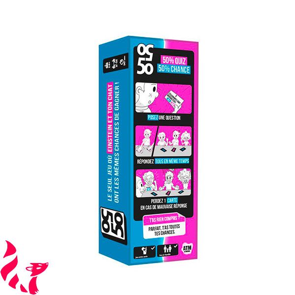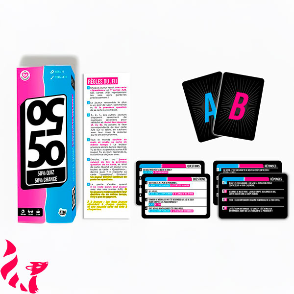 50/50 bouscule les codes du quiz classique avec un principe aussi simple que tendu : un joueur lit une question à deux choix. Les autres choisissent leur réponse en posant une carte bicolore face cachée. Puis chacun révèle sa décision. Une mauvaise réponse ? Une vie en moins. Le dernier joueur avec des cartes vie en main ne gagne pas forcément : c’est celui qui en a le plus qui l’emporte ! Le rythme est rapide, les règles ultra accessibles, et l’ambiance toujours au rendez-vous.