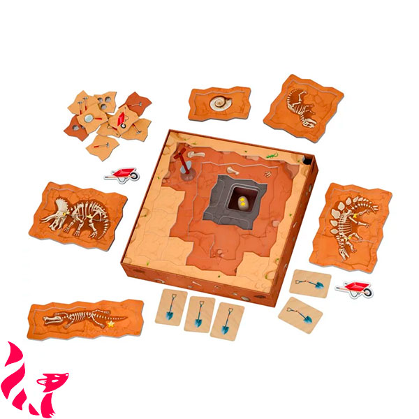 Transformez votre table de jeu en véritable site de fouilles grâce à un matériel 3D immersif et ingénieux : un terrain en volume sur plusieurs couches, une pelle-ventouse pour extraire les tuiles, et des plateaux Fossile à compléter au fur et à mesure des découvertes.