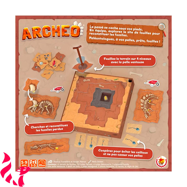 Archeo est un jeu de société coopératif de fouille archéologique, vous incarnez des paléontologues chargés d’exhumer les fossiles enfouis dans un terrain de fouilles à quatre niveaux. Creusez, coopérez et évitez les obstacles pour reconstituer les squelettes d’animaux préhistoriques.