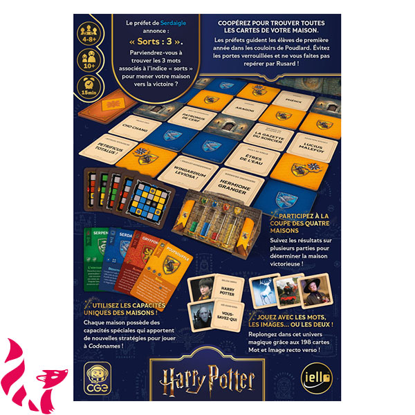Contenu : 198 cartes Mot/Image recto-verso, 1 support de cartes, 1 carte clé, 4 cartes Maison (Serpentard, Serdaigle, Gryffondor, Poufsouffle), cartes spéciales Maisons, 1 livret de règles.