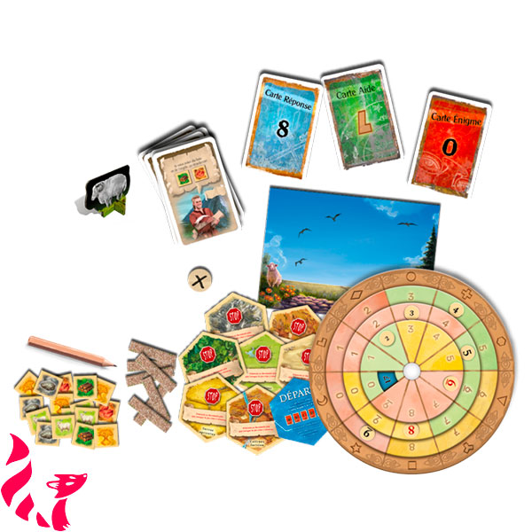 Contenu : 1 disque décodeur, 97 cartes, 8 documents pliés, 12 objets étranges, 16 jetons Ressource et un livret de règles.
