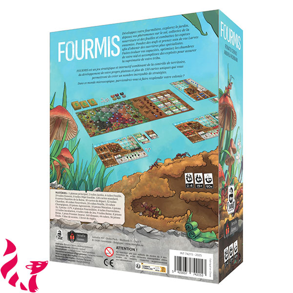 Contenu : 1 plateau principal, 2 tuiles Jardin, 6 tuiles Feuille, 29 tuiles Ennemi, 8 tuiles Objet insolite, 120 cartes standard, Chambre et Reine, 30 cartes de départ, 52 tuiles Champignon, 45 cubes Nourriture, 20 cubes Feuille, 10 cubes Sable, 25 jetons Agressivité, 10 jetons Mutation, 5 jetons Œufs, 3 dés, 3 plateaux Fourmilière, 5 tuiles Fourmilière, 8 jetons Incubation, 8 tuiles Aide de jeu, 5 tuiles Reine, 1 bloc de scores, 1 livret de règles.