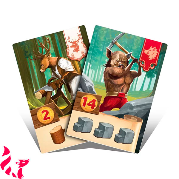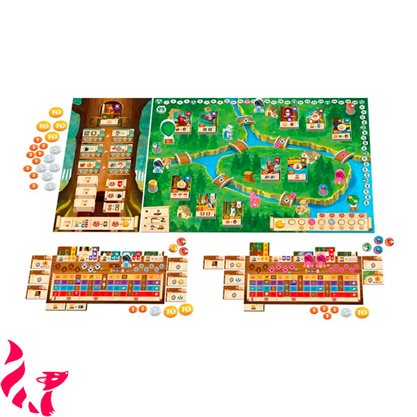 Contenu : 1 plateau principal, 1 plateau Arbre, 4 plateaux personnels, 109 cartes 43×65 mm, 26 tuiles Faveur de la Reine, 6 tuiles Objectif Pont (recto verso), plus de 80 jetons divers, 4 tuiles “Deck vide”, 1 jeton Premier joueur, 1 pion Montgolfière 14 tuiles Paco & Paca (mode solo uniquement), 1 livret de règles. Matériel des joueurs (pour chaque joueur) : 1 Ouvrier, 3 Maisons, 7 marqueurs Patte, 6 marqueurs Objectif Pont, 1 marqueur d’Investissement, 1 marqueur de Score, 4 marqueurs de ressource, 6 tuiles Action, 1 carte Maison.