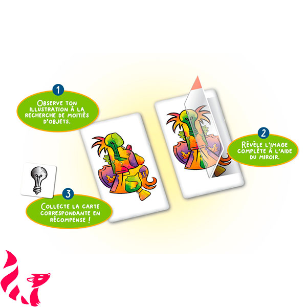 Dans le jeu Miroir Magique, les enfants observent leur carte à la recherche d’une moitié d’objet, placent le miroir pour reconstituer l’image entière, puis essaient d’identifier ce qui apparaît : un lion majestueux, un palmier géant, ou encore une ampoule rigolote.