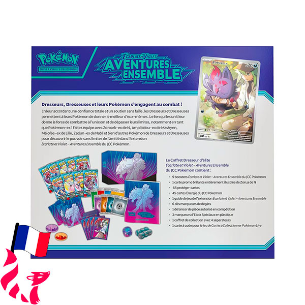 Le Coffret Dresseur d’élite Écarlate et Violet – Aventures Ensemble du JCC Pokémon contient : -9 boosters Écarlate et Violet – Aventures Ensemble du JCC Pokémon -65 protège-cartes -45 cartes Énergie du JCC Pokémon -1 guide de jeu de l’extension Écarlate et Violet – Aventures Ensemble -6 dés marqueurs de dégâts -1 dé lancer de pièce autorisé en compétition -2 marqueurs d’États Spéciaux en plastique -1 coffret de collection avec 4 séparateurs -1 carte à code pour le Jeu de Cartes à Collectionner Pokémon Live