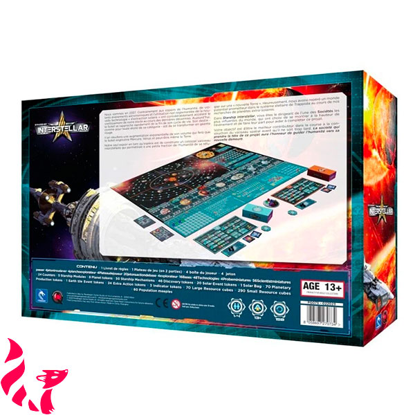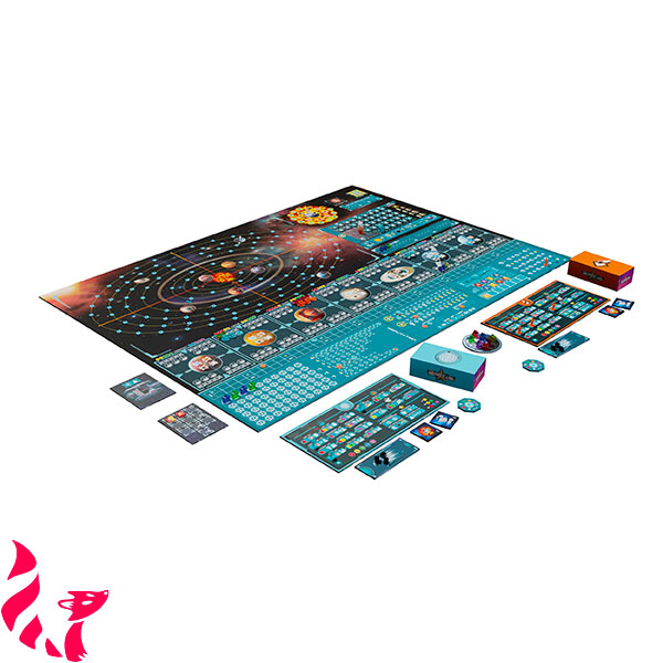 Contenu : 1 plateau de jeu en deux parties, 4 boîtes de Joueur, 4 jetons Passer, 4 jetons Trou de Ber, 4 planches Explorateur, 4 plateaux Joueur, 20 jetons Action de base, 4 Explorateurs, 16 Bases, 48 Technologies, 4 Sondes, 56 Scientifiques, 24 Pions, 5 modules de Vaisseau Spatial, 8 jetons Planète, 50 jetons Mécanisme du Vaisseau, 46 jetons Découverte, 20 jetons Événement Solaire, 1 sac Solaire, 70 jetons Production Planétaire, 1 plateau Terre, 24 jetons Action Supplémentaire, 3 Indicateurs, 70 grands cubes Ressource, 290 petits cubes Ressource, 60 meeples de Population, 1 livret de règles.