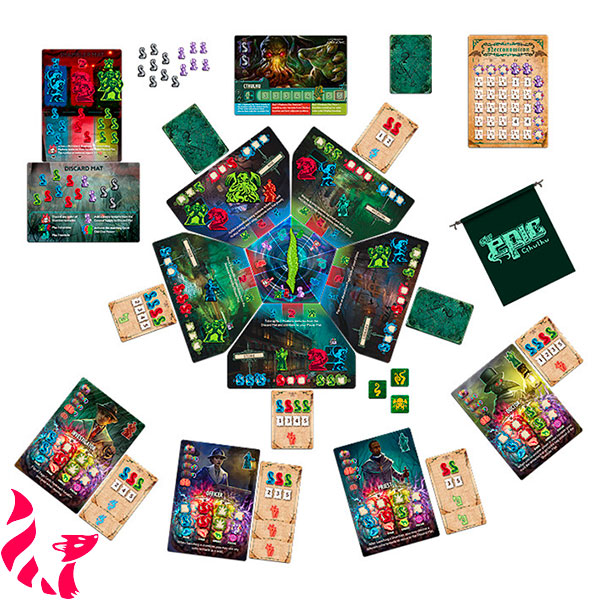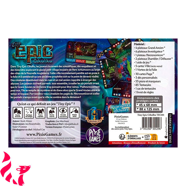 Tiny Epic Cthulhu offre une expérience de jeu tendue et engageante, avec des mécanismes innovants de construction de sacs et de stop ou encore. Il comprend un composant surprenant : une toupie ! – qui capture parfaitement l’essence de la folie et du chaos lovecraftiens, tout en conservant les éléments stratégiques que vous attendez de la série Tiny Epic. Chacun de vous devra utiliser ses pouvoirs spéciaux, utiliser les actions uniques disponibles dans la ville et gérer soigneusement sa propre folie.