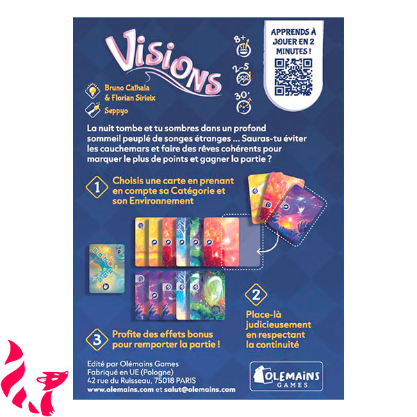 Visions est un jeu de carte sur le thème des rêve pour 2 à 5 joueurs, dans lequel vous devrez essayer de former les rêve les plus optimiser afin de marquer le plus de points ou d’atteindre le bout de la piste reflet en premier. Jouer sur les mécanique de reflet, écho et cauchemar afin de gêner vos adversaire et avance vers la victoire.