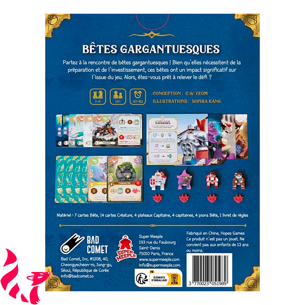 Contenu : 7 cartes Bête, 14 cartes Créature, 4 plateaux Capitaine, 4 capitaines, 4 pions Bête, 1 livret de règles.